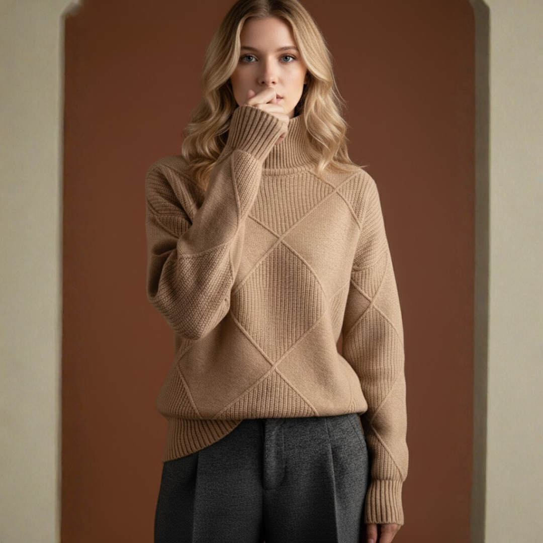 Ce pull à col montant séduit par ses lignes graphiques et son jeu de textures en relief. Son design moderne avec empiècements en maille côtelée offre une silhouette structurée tout en garantissant un confort optimal. Parfait pour composer un look élégant et chaleureux au quotidien.